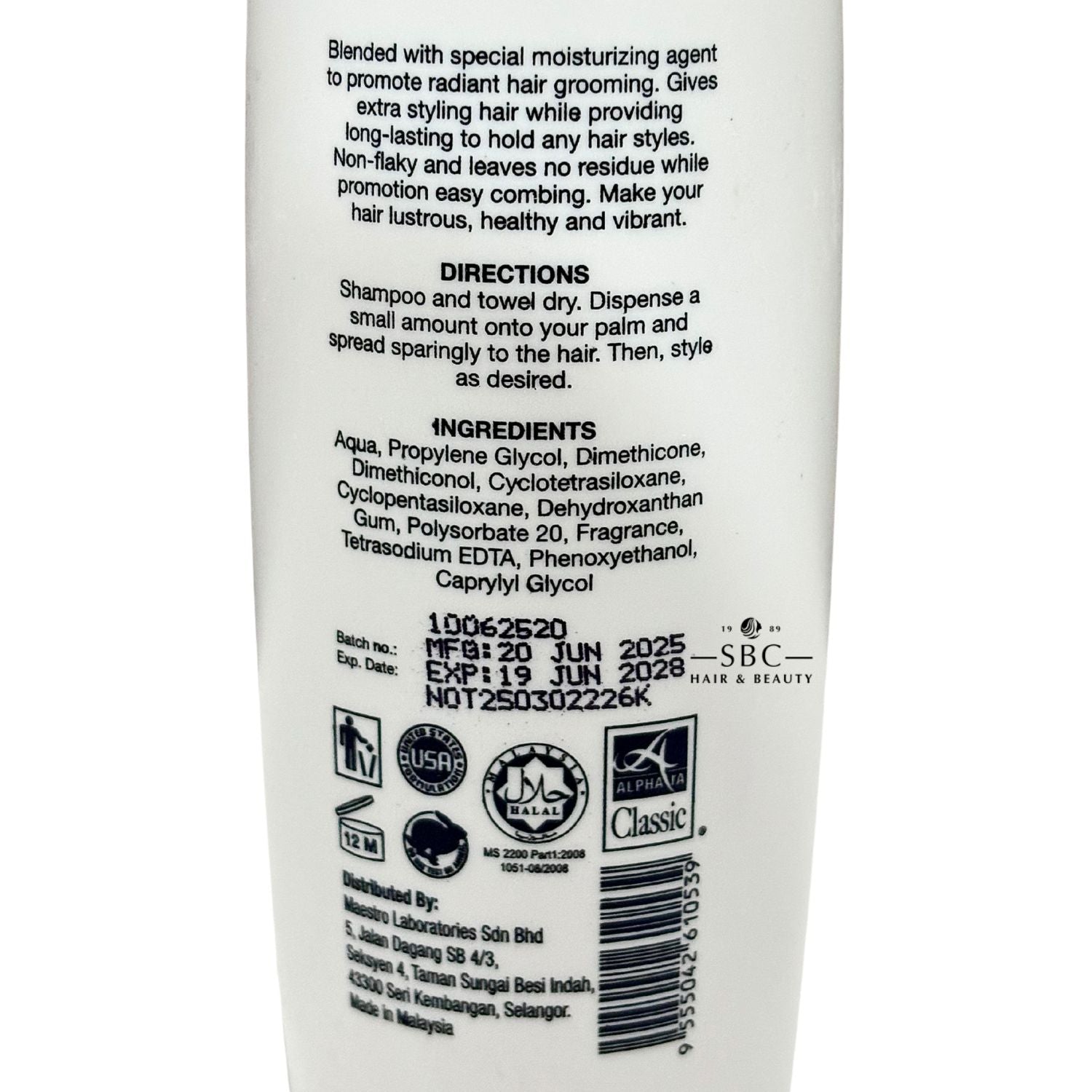 "BLENDED WITH SPECIAL MOISTURIZING AGENT TO PROMOTE RADIANT HAIR GROOMING. GIVES EXTRA STYLING HAIR WHILE PROVIDING LONG-LASTING TO HOLD ANY HAIR STYLES. NON-FLAKY AND LEAVES NO RESIDUE WHILE PROMOTION EASY COMBING. MAKE YOUR HAIR LUSTROUS, HEALTHY AND VIBRANT."