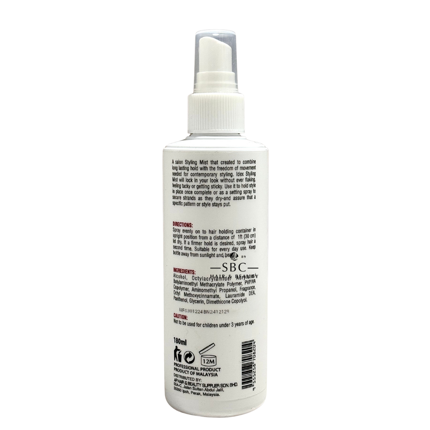 "A SALON STYLING MIST THAT CREATED TO COMBINE LONG LASTING HOLD WITH THE FREEDOM OF MOVEMENT NEEDED FOR CONTEMPORARY STYLING. IDEX STYLING MIST WILL LOCK IN YOUR LOOK WITHOUT EVER FLAKING, FEELING TACKY OR GETTING STICKY. USE IT TO HOLD STYLE IN PLACE ONCE COMPLETE OR AS A SETTING SPRAY TO SECURE STRANDS AS THEY DRY-AND ASSURE THAT A SPECIFIC PATTERN OR STYLE STAYS PUT."