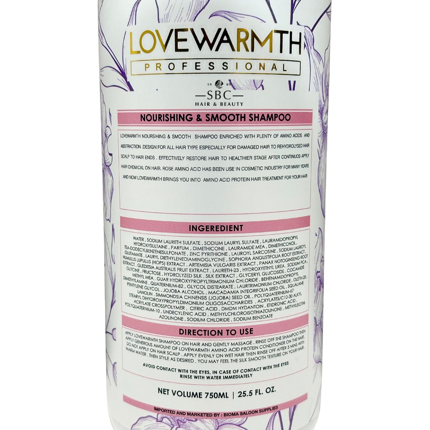 "LOVEWARMTH NOURISHING & SMOOTH SHAMPOO ENRICHED WITH PLENTY OF AMINO ACIDS AND ABSTRACTION. DESIGN FOR ALL HAIR TYPE ESPECIALLY FOR DAMAGED HAIR TO REHYDROLYSED HAIR SCALP TO HAIR ENDS. EFFECTIVELY RESTORE HAIR TO HEALTHIER STAGE AFTER CONTINUOUS APPLY HAIR CHEMICAL ON HAIR. ROSE AMINO ACID HAS BEEN USED IN COSMETIC INDUSTRY FOR MANY YEARS AND NOW LOVEWARMTH BRINGS YOU INTO AMINO ACID PROTEIN HAIR TREATMENT FOR YOUR HAIR."